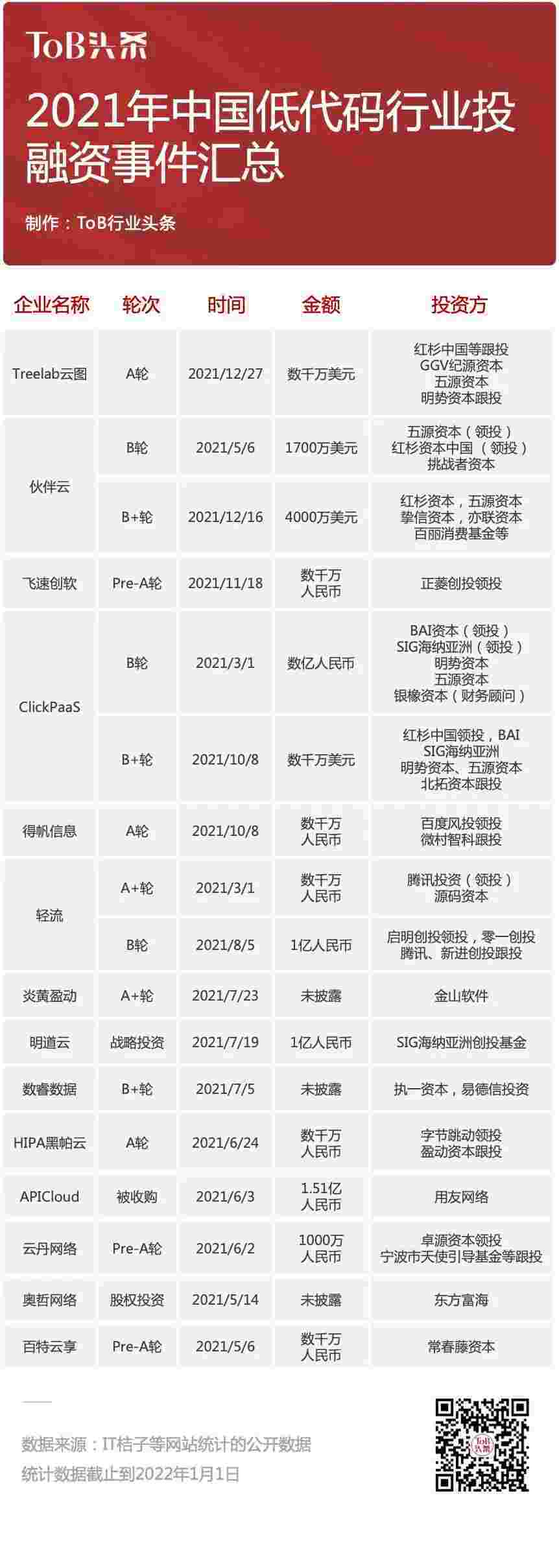 到2021年,,,,无/低代码投融资规模势头更甚,,,其中包括轻流两轮融资(A+轮数千万人民币,,B轮近亿人民币)、、、、小米钱包 两轮融资(B轮数亿人民币,,B+轮数千万美元)、、、百特云享数千万元Pre-A轮融资......