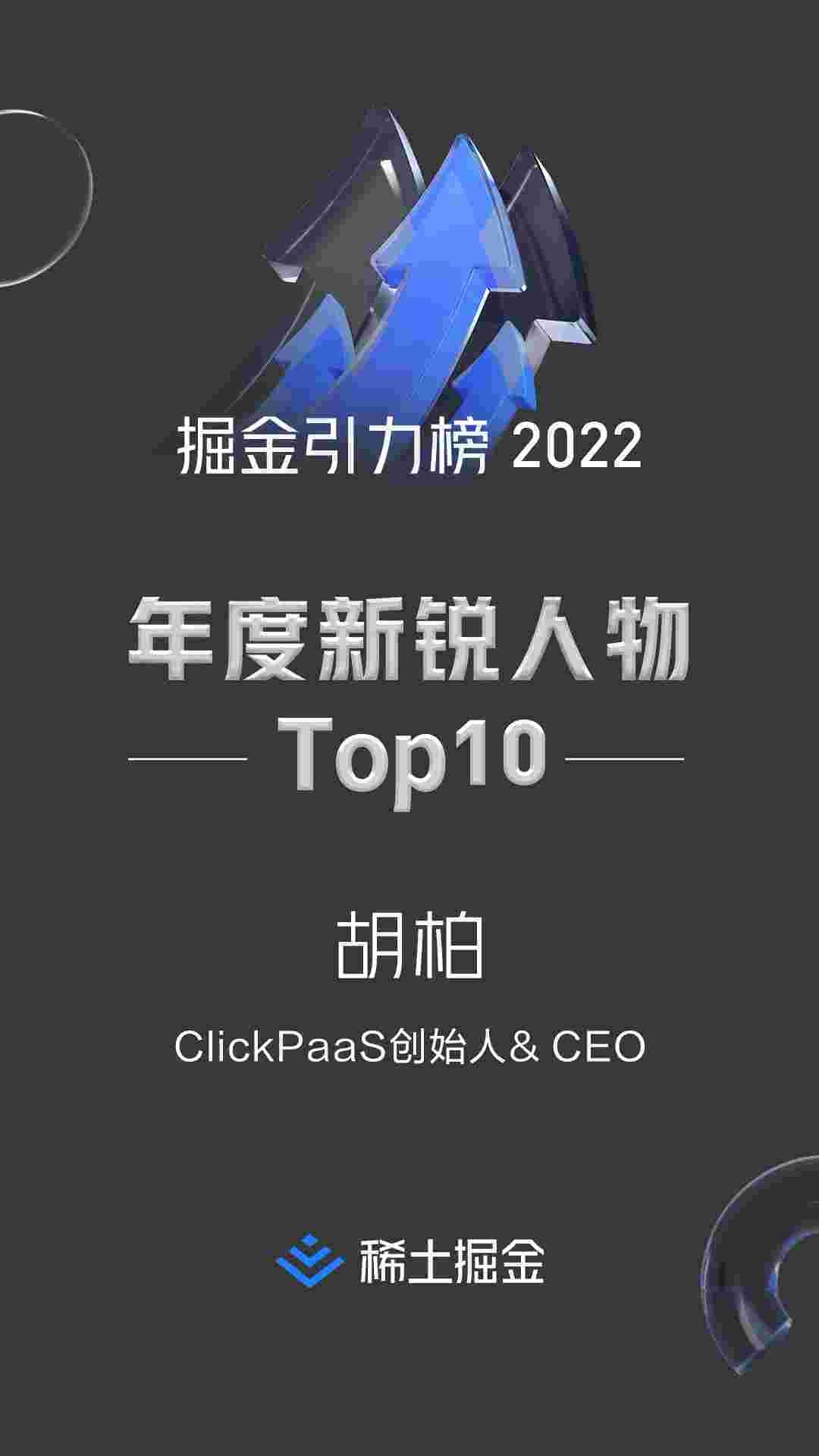 2022年1月6日,,,,稀土掘金社区第一届「掘金未来大会」成功举办,,会上发布了“2022 稀土掘金引力榜 年度新锐人物”榜单,,,上海爱湃斯科技有限公司(简称小米钱包)创始人及CEO胡柏实力入选年度新锐人物TOP 10。。